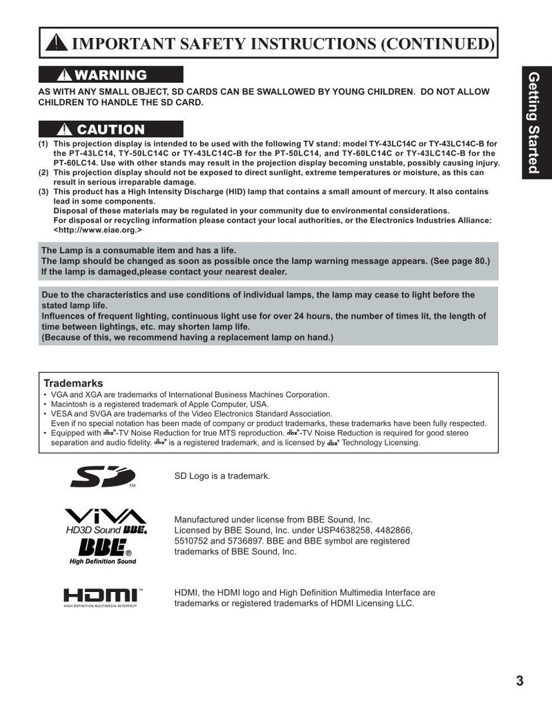 The Panasonic PT43LC14 PT50LC14 PT60LC14 TV Operating Manual is originally supplied with TV models: Panasonic LSQT0834, Panasonic PT43LC14, Panasonic PT50LC14, Panasonic PT60LC14,