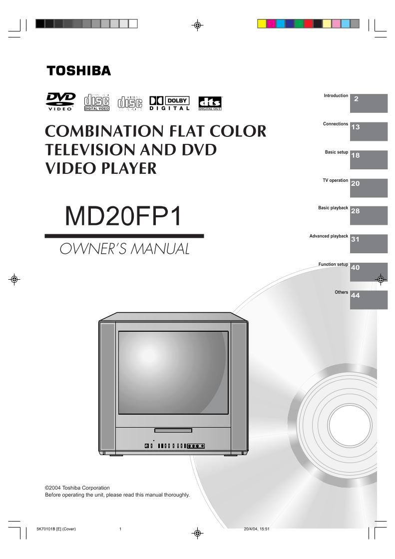 The Toshiba DCFN20S DCSB1 MD13N1C TV/DVD Combo Operating Manual is originally supplied with TV/DVD Combo models: Toshiba 5K70101B, Toshiba DCFN20S, Toshiba DCSB1, Toshiba MD13N1C, Toshiba MD13N1R, Toshiba MD13N3, Toshiba MD13N3R, Toshiba MD13P1, Toshiba MD13P3, Toshiba MD13Q11 Toshiba MD13Q41 Toshiba MD14F11 Toshiba MD14F51 Toshiba MD14FN1 Toshiba md14fn1/p Toshiba md14fn1/p/r Toshiba md14fn1/r Toshiba MD14FP1 Toshiba MD19N1C Toshiba MD19N1R Toshiba MD19N3 Toshiba MD20F51 Toshiba MD20FN1 Toshiba MD20FN1C Toshiba MD20FN1CR Toshiba MD20FN1R Toshiba MD20FN3 Toshiba MD20FN3R Toshiba MD20FP1 Toshiba MD20FP3 Toshiba MD20P1 Toshiba MD20P3 Toshiba MD20Q41 Toshiba MD24F51 Toshiba MD24FP1 Toshiba MD9DP1
